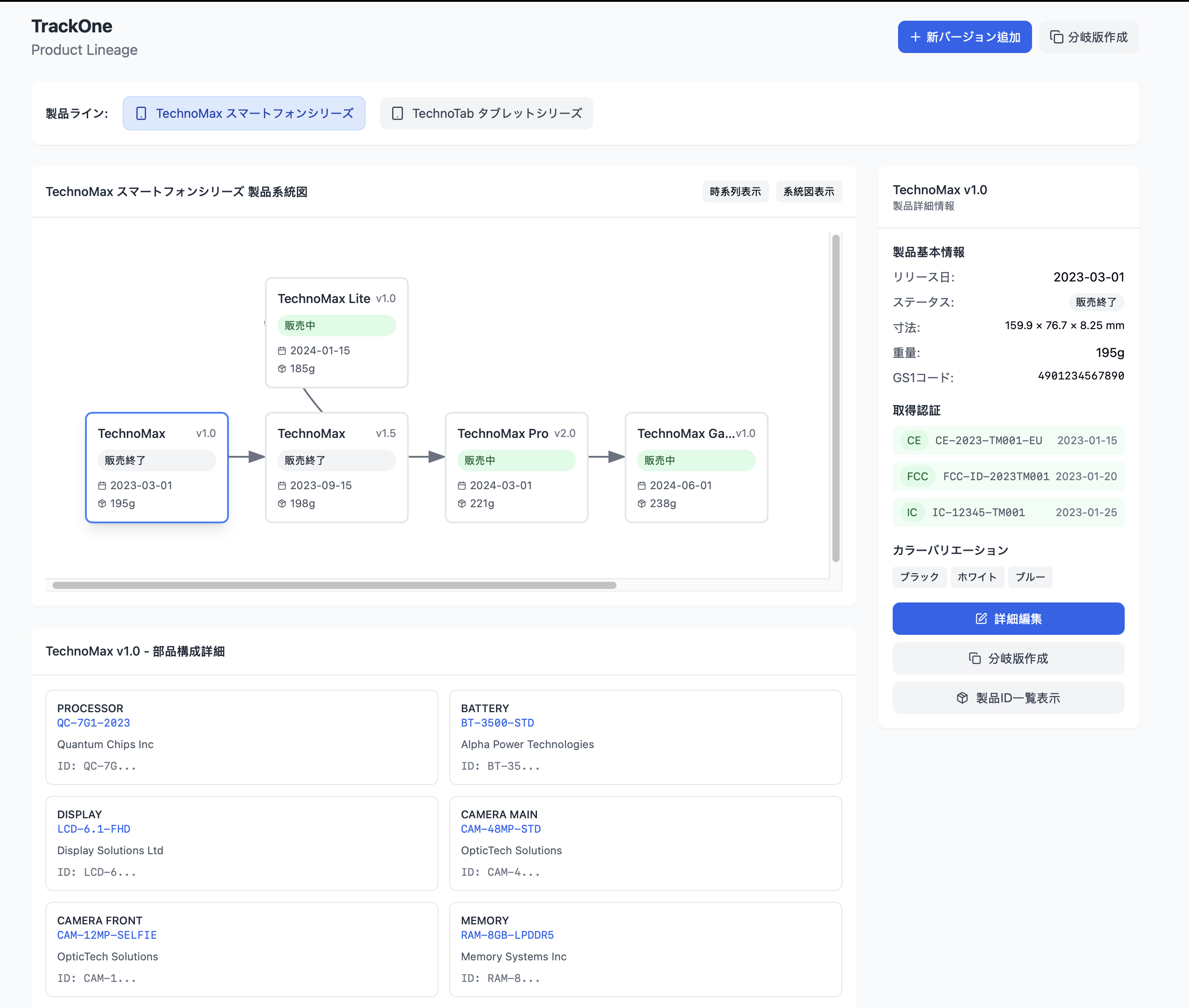 TrackOneは、全バージョンの仕様と構成を明文化し、現場が共通して参照できる「情報の基準点」を提供します。バージョンが製品IDと直結しているため、スキャンするだけでその製品が「どのバージョン」で「どういう構成か」がわかり、帳票や承認プロセスもバージョンに基づいて自動判定・出力されます。複数部門が別々のExcelを持ち寄って確認するような手間は、もう必要ありません。