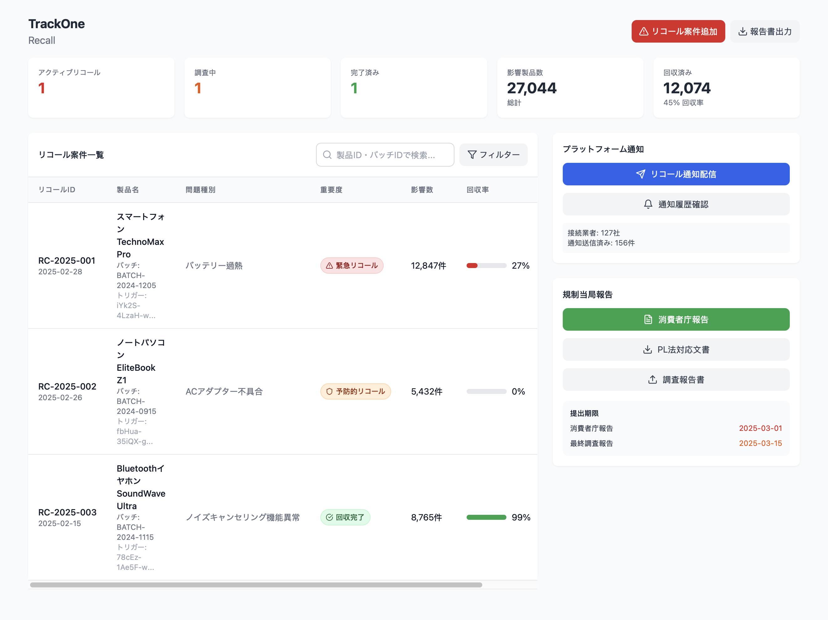事故は予測できません。ですが、事故のときにどれだけ速く動けるかは、準備によって決まります。サプライチェーンにおいては、企業の枠を超えた情報の即時共有が必要不可欠になってきました。製品の追跡、問題品の即時特定、出荷停止の判断、取引先との連絡、規制機関への報告——そのすべてが、数クリックで完了する未来を、TrackOneは現実のものとしています。
